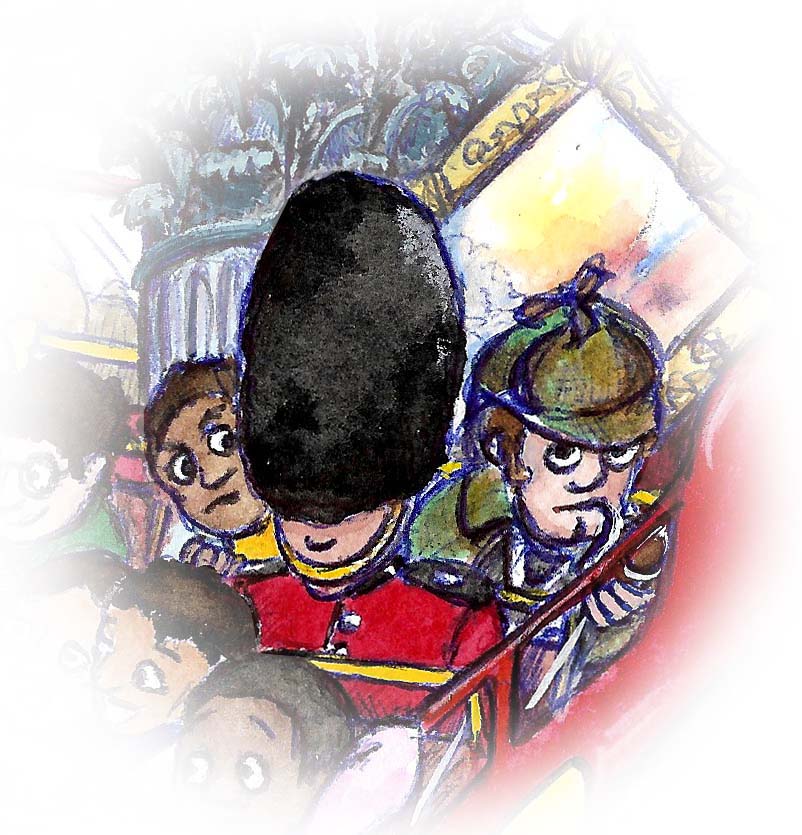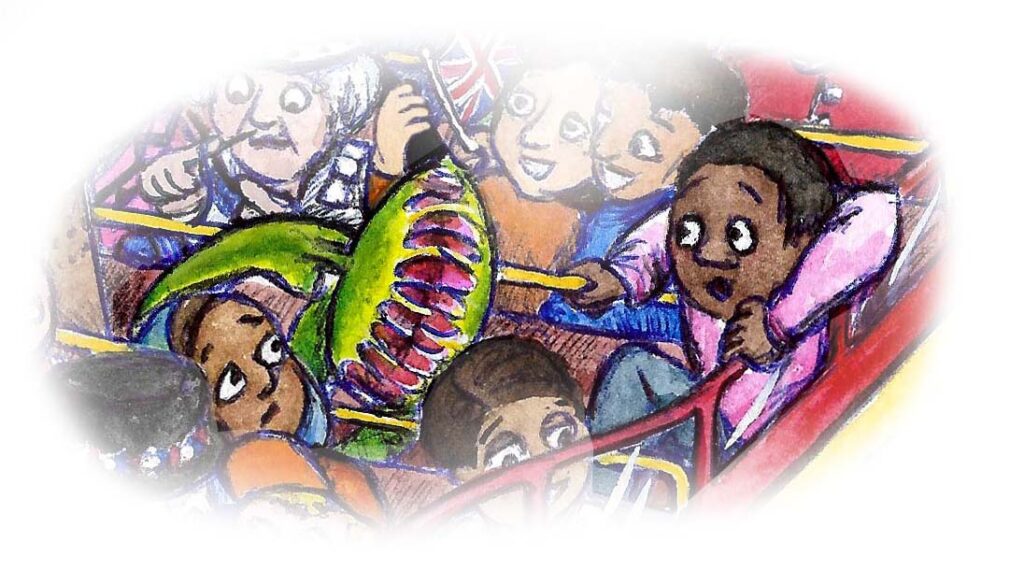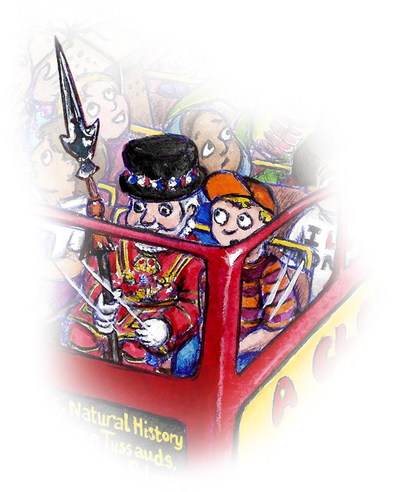 London Tour Bus “ALL ABOARD! HOLD VERY TIGHT PLEASE!”What would you see on a tour of London? What souvenirs would you pick up along the way? It looks like an interesting gift was bought from Kew Gardens. What about the present from London Zoo? Does it always rain in London? Some of the sights of London can make you feel a little uncomfortable. Being short I often find it tricky to see a view. I wonder what the soldiers keep under their bearskins… What other famous faces can you spot? “ALL ABOARD! HOLD VERY TIGHT PLEASE!”What would you see on a tour of London? What souvenirs would you pick up along the way? It looks like an interesting gift was bought from Kew Gardens. What about the present from London Zoo? Does it always rain in London? Being short I often find it tricky to see a view. I wonder what the soldiers keep under their bearskins… Some of the sights of London can make you feel a little uncomfortable. How is it that there is a Turner painting on the bus? And what is Sherlock Holmes doing? Could there be a mystery afoot? What other famous faces can you spot?